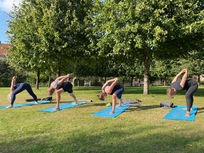 Når vejret er godt, har vi mulighed for at rykke udenfor og dyrke yoga i den friske luft i vores store grønne gård.